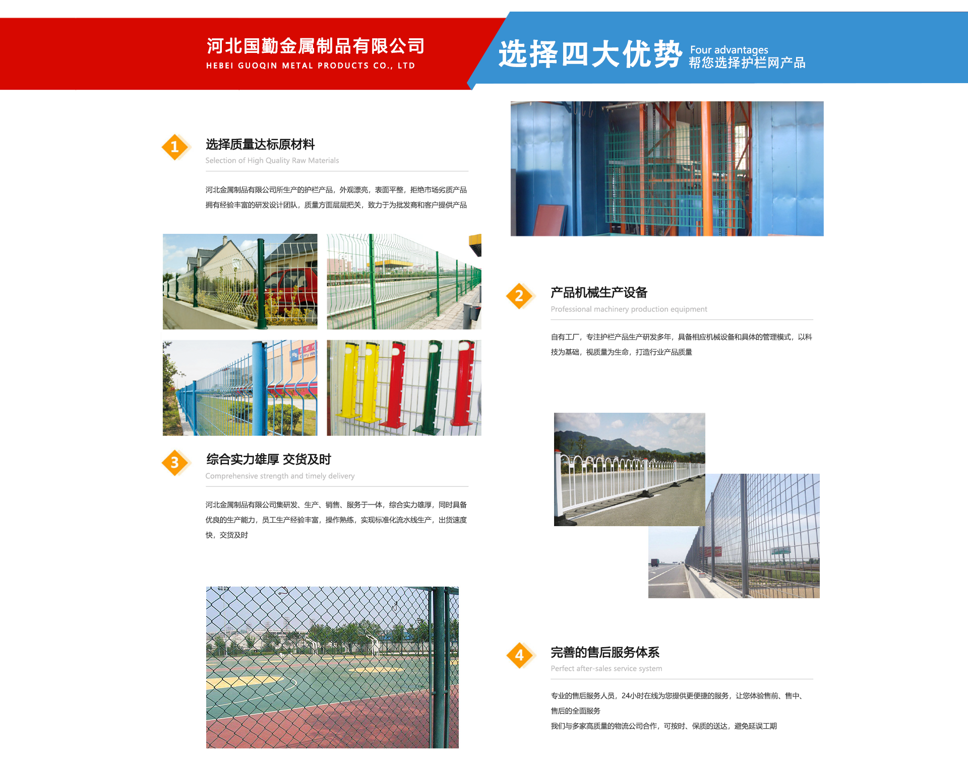 河北國(guó)勤金屬制品有限公司位于亞洲較大的絲網(wǎng)生產(chǎn)基地--享譽(yù)世界的“中國(guó)絲網(wǎng)之鄉(xiāng)”美譽(yù)的河北省安平縣境內(nèi)。主要是以研發(fā)設(shè)計(jì)、制造生產(chǎn)、銷售服務(wù)于一體的高科技現(xiàn)代化企業(yè)。河北國(guó)勤金屬制品有限公司主營(yíng)產(chǎn)品有護(hù)欄網(wǎng),隔離網(wǎng),市政工程,草坪護(hù)欄等各種系列產(chǎn)品的制造廠家。我廠產(chǎn)品被廣泛應(yīng)用于公路、石化、化工、港口、合金、電力、造紙、鋼鐵、建材、市政、石油、污水處理及一般工業(yè)廠房、市政建設(shè)等各個(gè)領(lǐng)域。公司自成立以來(lái)一直為客戶提供優(yōu)良,貼心的服務(wù)。從售前售中售后我們都以客戶為導(dǎo)向,以設(shè)計(jì)先進(jìn)、高科技手段、價(jià)格低質(zhì)量?jī)?yōu)等多方面為客戶提供整體全面的服務(wù)。我們相信科技創(chuàng)新的力量,本廠在產(chǎn)品技術(shù)基礎(chǔ)上不斷探索與創(chuàng)新,力求以更高品質(zhì)的產(chǎn)品、更合理的價(jià)格、更完善的售后服務(wù)、不斷豐富的產(chǎn)品線滿足于每一位客戶的需求。